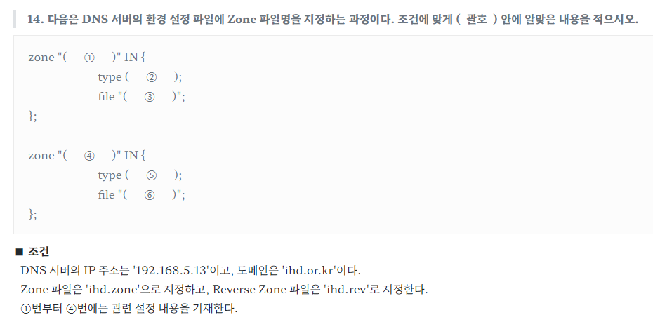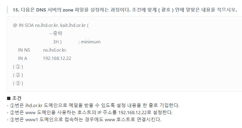 다음은 DNS zone 파일에 대한 내용이다. ( 괄호 )안에 알맞은 내용을 적으시오.(12점)